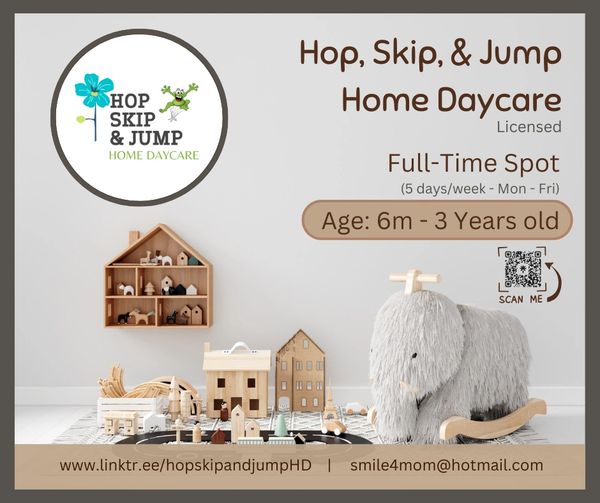 I currently have one Full-Time (5 days a week) spot for a child between 24 months and 3 years old - February 17th start date OR any age as of April 15th.